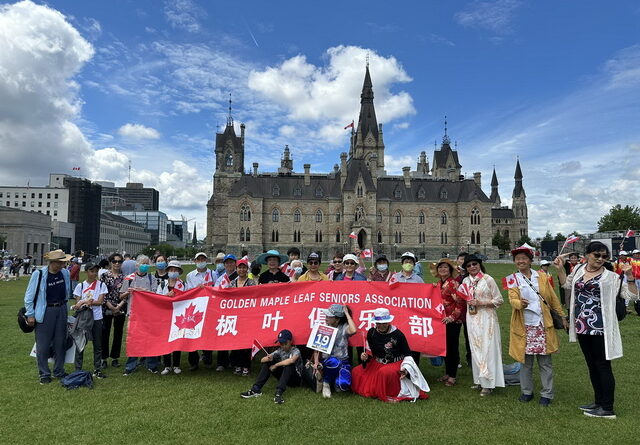 6:30AM (6月24日晨) 。我从朦胧中醒来,听见细雨沥沥敲打外窗,人声嘈杂不绝于耳,见对面的「华侨大厦」外廊下已聚满了很多人。送人的车不断地从四面八方开来, 人越聚越多, 背着包、打着伞,在等待着乘坐大巴去渥太华参加「反思排华法案100周年多地集会国会山庄」活动。这里是一个乘车点。规定7点发车,必须7点之前到。车不等人,人等车。