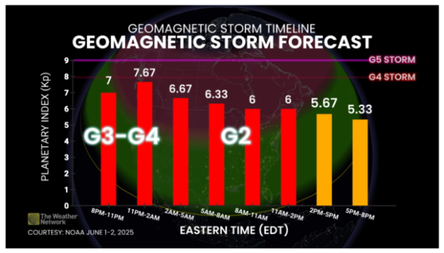 据天气网络报道,一场强度为G4的强烈地磁风暴于6月1日凌晨抵达地球大气层,有望在周日晚间为加拿大部分地区带来绚丽的北极光表演——前提是野火烟雾和云层不要阻挡天空。