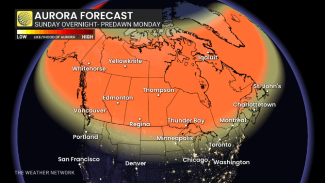 对于这次预测中的极光秀,加拿大人可能会感到失望,也可能惊喜不已,这一切都取决于他们所在地区的天况。