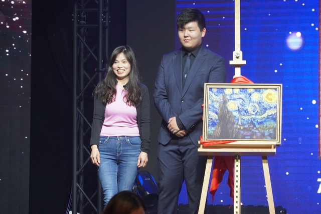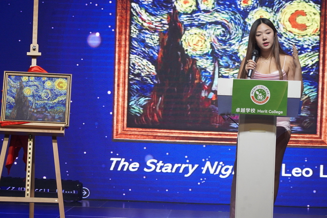拍卖主持人向满场宾客动情地解说拍卖品为11年级学生Leo Li,亲手临摹的梵高《星夜》参与拍卖,“画布上承载的是一位少年对世界的关怀。”