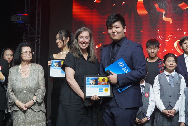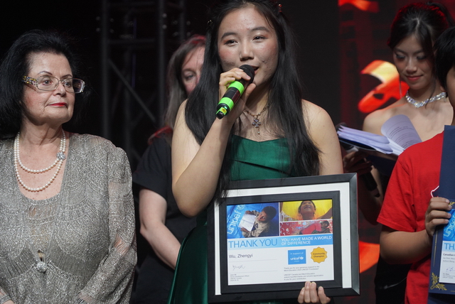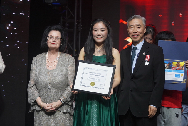 慈善晚会的高潮出现在“青年领袖奖(Youth Leadership Award)”颁奖的荣耀时刻。聚光灯下,12年级IB学生吴正仪(Jenny Wu)接过了沉甸甸的奖杯。这位连续两年担任UNICEF慈善晚会核心组织者的女孩,曾带领团队策划活动、筹集善款,因此蝉联“UNICEF社区冠军”。而更引人瞩目的是,她以卓越的学术成绩与领导潜力,刚刚获得美国哈佛大学的录取通知书。 “从公益实践走向世界名校,这正是教育最完整的闭环,”现场主持人的评价道出深意。吴正仪的成长轨迹,生动诠释了Merit College所倡导的“学术卓越仅是成功方程式的一部分”这一办学信念。卓越高中十五年来始终在落实着用“全人教育”来综合塑造学生社会责任感的公益使命,而这种培养模式在晚会的节目中也得到了精彩展现。
