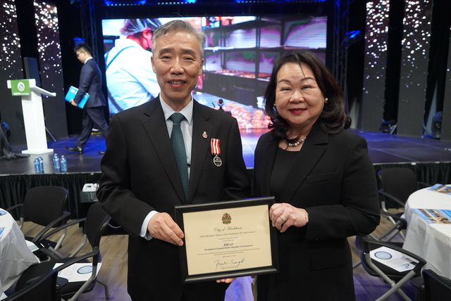 万锦市Stouffville Hospital Foundation的谭贵琼(Sandra Tam)致词并代表市长颁发奖牌