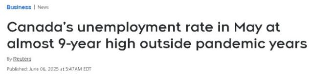 加拿大最新就业数据显示,5月全国失业率升至 7%,为近九年来(不含疫情期间)最高水平,失业人数高达160万人,比去年同期增加近14%。