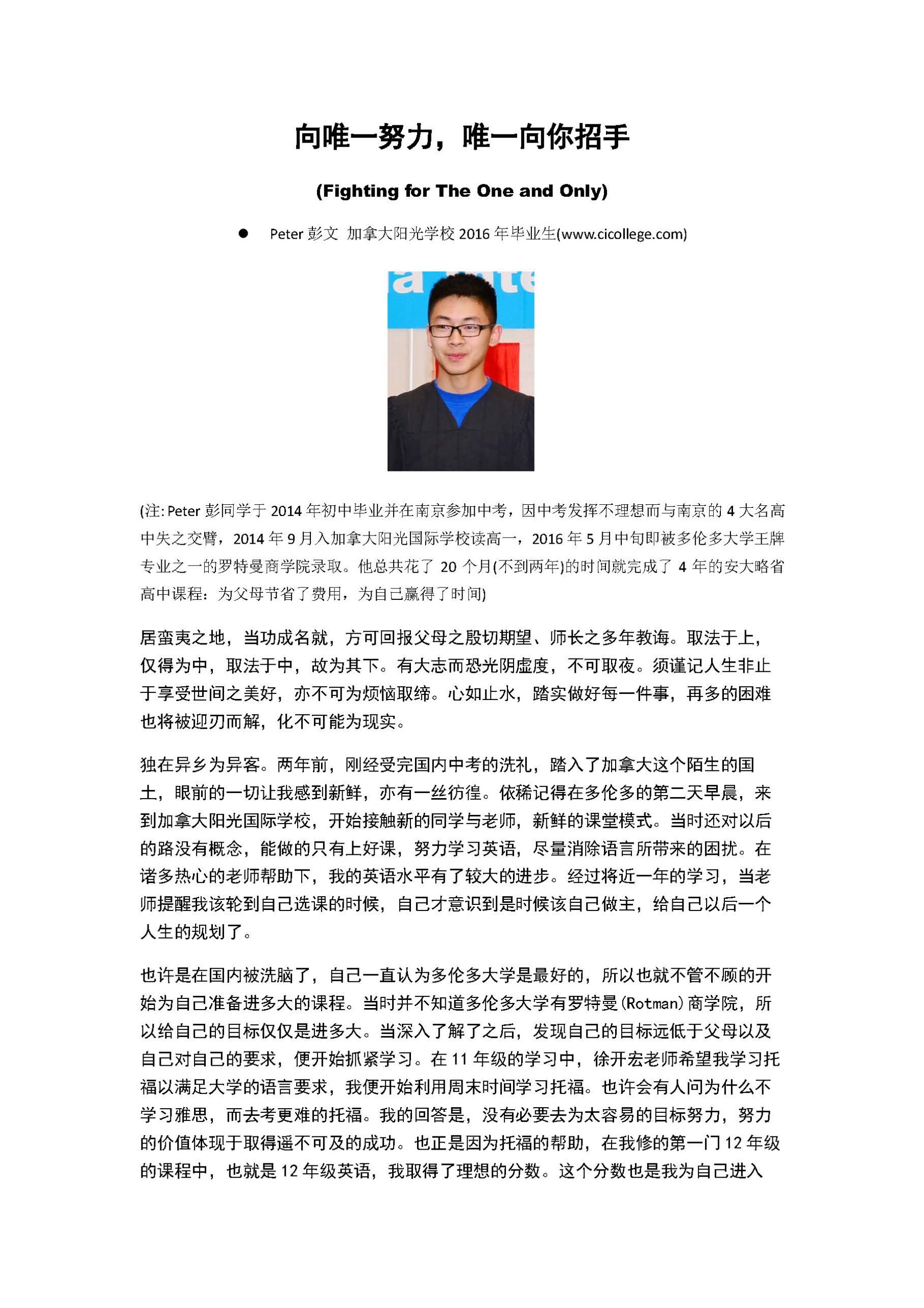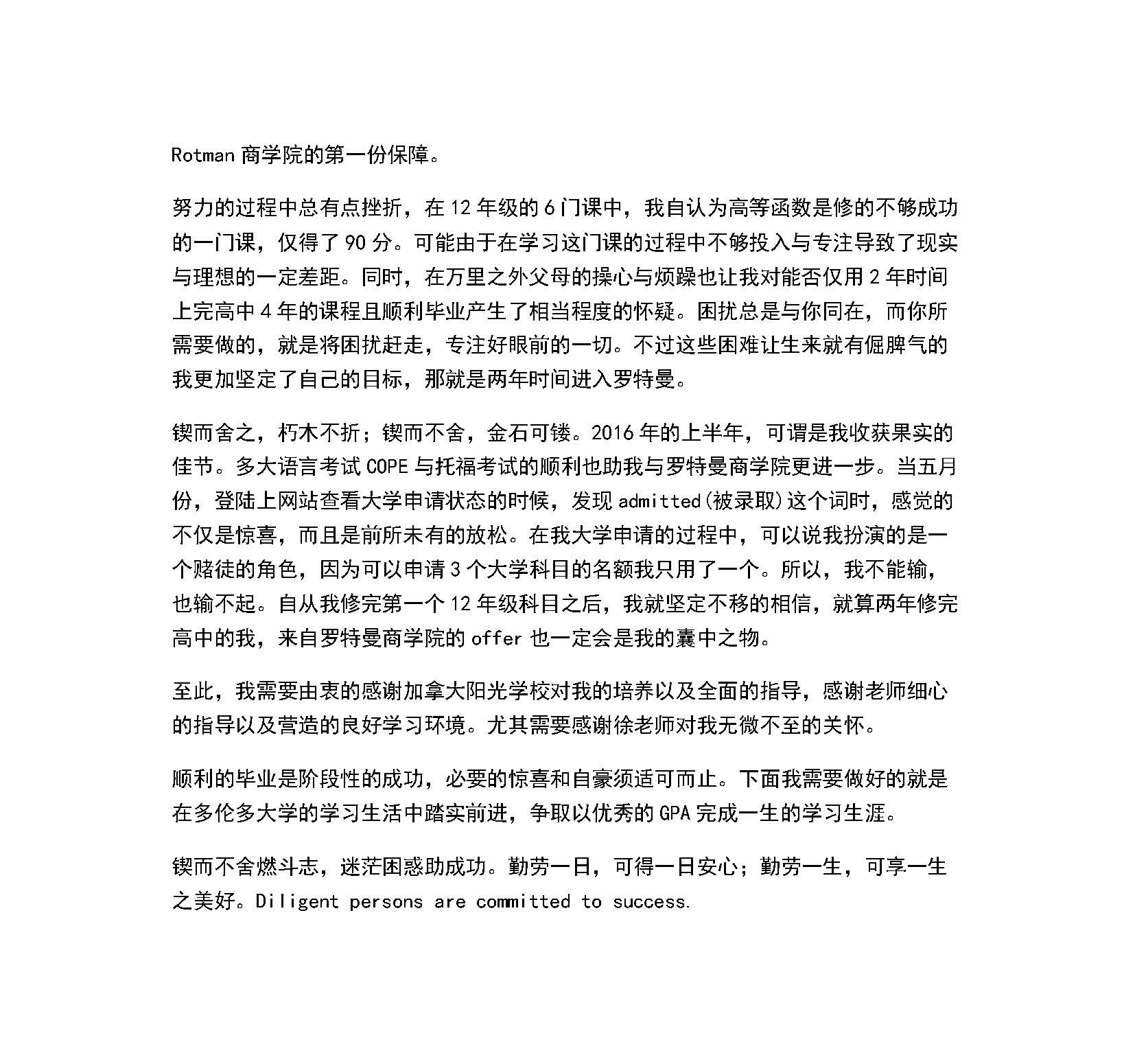 来自南京的Peter同学中考后没能如意进入心目中的南京4大名高中,就选择的到阳光学校就读,2年顺利高中毕业并被多伦多大学要求比较高的专业之一罗特曼商学院录取(目前他已顺利完成学业,并先后在加拿大银行等机构任职),在阳光高中毕业时,写了一点感悟供大家参考。