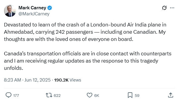 加拿大总理卡尼今早在X平台上发文,表示:“得知一架飞往伦敦的印度航空客机在艾哈迈达巴德坠毁,机上有 242 名乘客,其中包括一名加拿大人,深感悲痛。我的心与机上所有人员的亲属同在。加拿大交通部门正与相关部门保持密切联系,我也在持续关注救援进展并定期接收最新情况通报。”