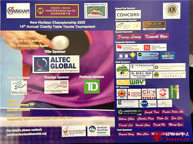 加港新里程狮子会于6月12日(星期四)召开记者会,正式公布由顺达移民(Altec Global)冠名赞助的第十四届年度慈善乒乓球比赛将于2025年7月13日(星期日)在万民卫斯理中心(Markham Wesley Centre)隆重举行。