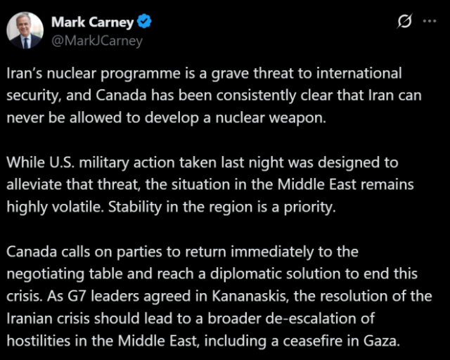 卡尼周日上午在X平台上发文表示,“伊朗的核计划对国际安全构成严重威胁,加拿大一贯明确表示,绝不能允许伊朗获得核武器”。“虽然美国昨晚采取的军事行动旨在缓解这一威胁,但中东局势依然高度不稳定。该地区的稳定仍是当务之急。”