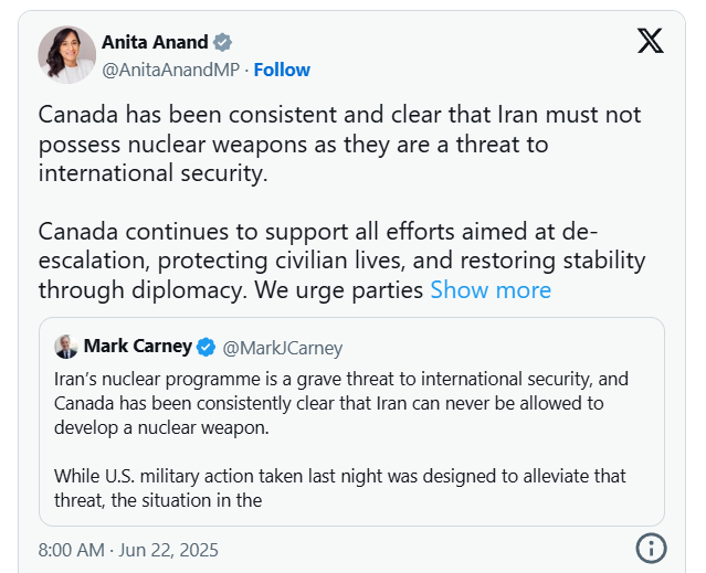 Anand表示,她与卡尼总理正持续接收有关最新局势的简报,并“确保提供一切必要资源,以支持加拿大保护本国公民的工作”。