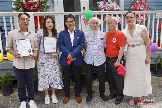 两位万锦约克区区议员何胡景(左3)李国贤(右2)同赠贺信