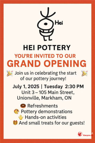 2025年7月1日,加拿大国庆之际,陶艺工作室“喜陶 Hei Pottery”於人村105 Main Street Unionville 盛大开业。当天现场高朋满座,艺友云集,两位万锦—约克区区议员何胡景(Allan Ho)与李国贤(Isaac Li)莅临祝贺,政要嘉宾与艺术界人士齐聚一堂,为这个充满匠心与潮流气息的新空间送上祝福。