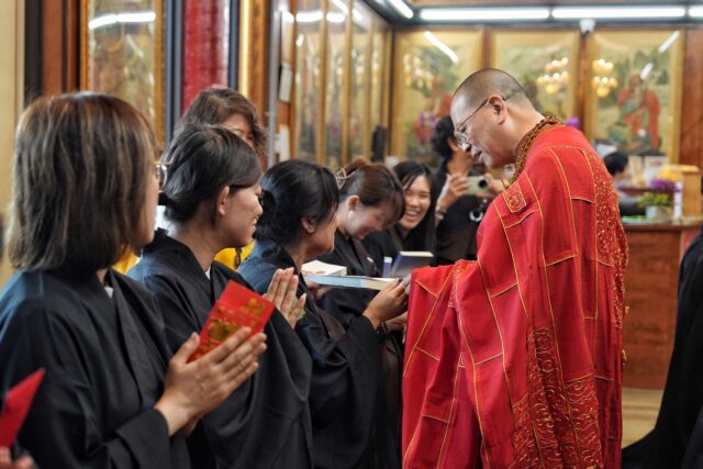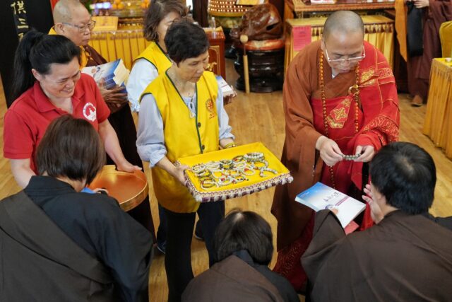 在庄严殊胜的观音成道纪念法会中,两位来自本地的西方学员庄严披上海青,正式在三宝座前顶礼发愿,皈依佛法僧,成为佛门弟子