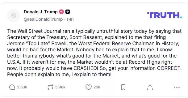 川普昨日在真实社群平台激动发文,痛批《华尔街日报》再度刊登一篇“典型的不实报导”,“称财政部长贝森特向我阐明开除‘慢半拍’鲍尔—这个史上最烂的联准会主席将不利于市场”。