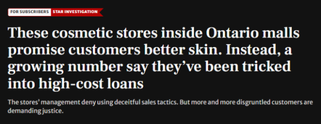 Toronto Star采访的12名顾客表示,他们在STC和伦敦(安省)的4家化妆品店被“套路”,甚至“胁迫”签下高息贷款购买昂贵的护肤设备,其中11人因此背上数千加元债务。
