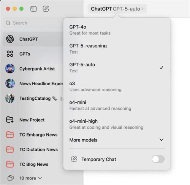 此前就有爆料,Cursor团队已开始内部测试GPT-5-Alpha。该模型表现惊艳,几乎能一次性完成任何任务,甚至能轻松开发小游戏。还有开发者在MacOS ChatGPT应用中,发现了GPT-5-Auto和GPT-5-Reasoning模型。