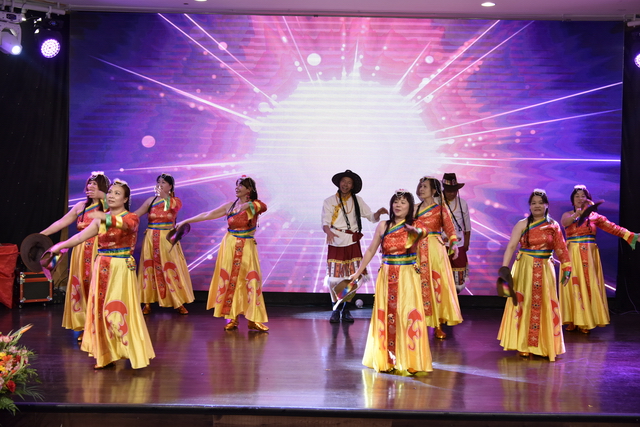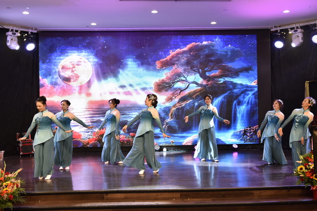在美味佳肴陆续上桌的同时,舞台化作艺术的殿堂。大合唱《大中国》《万水千山总是情》气势磅礴,赢得热烈掌声。广海子晴团队带来儿童舞蹈《长安幻夜》,稚嫩灵动,充满童真之趣。随后,曾金荷小姐与陆超成先生深情合唱《敖包相会》,歌声悠扬动人;Jennifer Min老师率领学生团队带来的儿童龙鼓表演,鼓声激昂,节奏明快,点燃了全场氛围。
