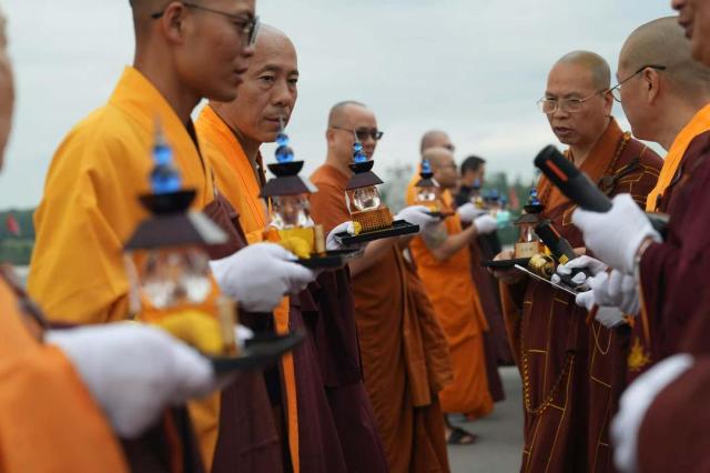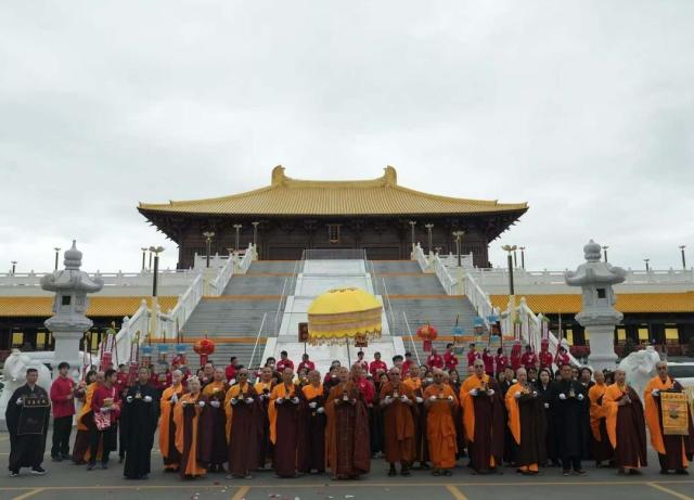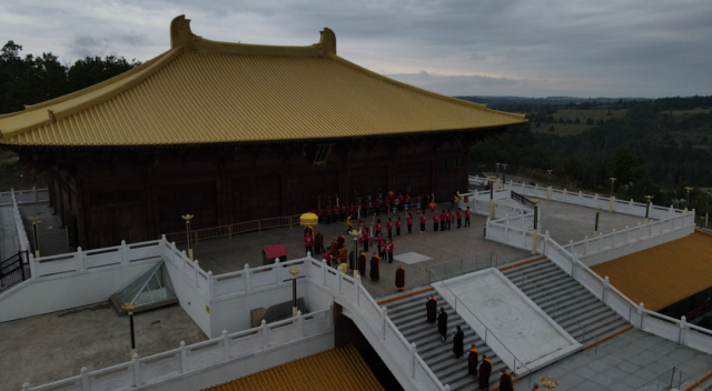 上午十时,舍利迎至加拿大五台山。大雄宝殿钟鼓齐鸣,殿前红毯铺展,幡幢随风飘扬,四众弟子虔心列队,迎候舍利到来。在达义大和尚的引领下,僧众持香,唱诵佛号,庄严隆重地举行舍利移交与安奉仪式。