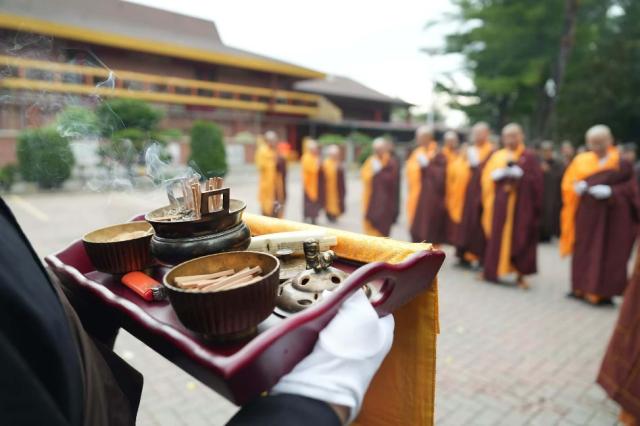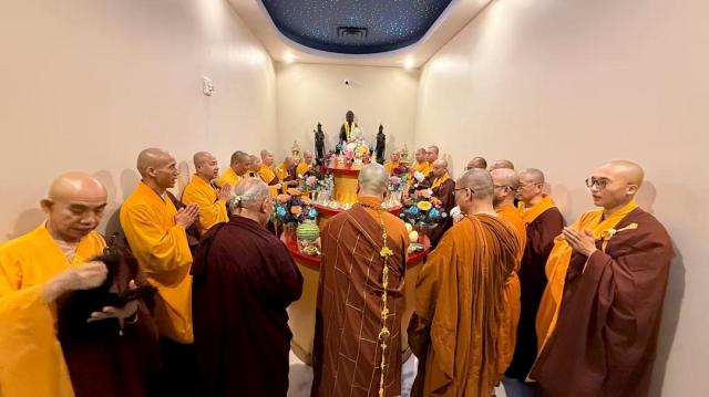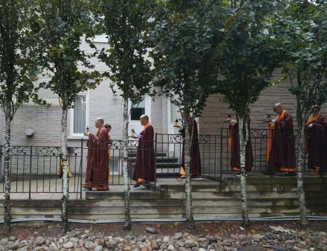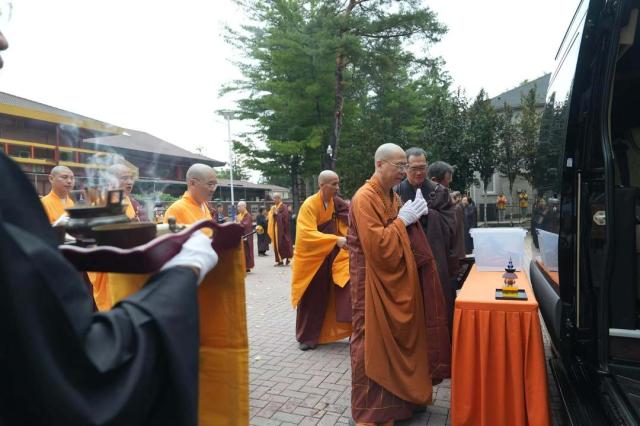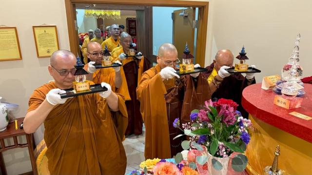 2025年8月17日清晨,加拿大佛教会会长、湛山精舍住持达义大和尚率领两序大众,于湛山精舍性空长老生前曾驻锡的寮舍,虔诚恭请长老舍利。清晨的寮舍内香烟缭绕,梵音袅袅,僧俗弟子齐聚一堂,皆以至诚心恭敬顶礼,双手合十,目含热泪,心怀无尽的感恩与敬仰。场面肃穆而庄严,映照着长老一生慈悲济世的风范。