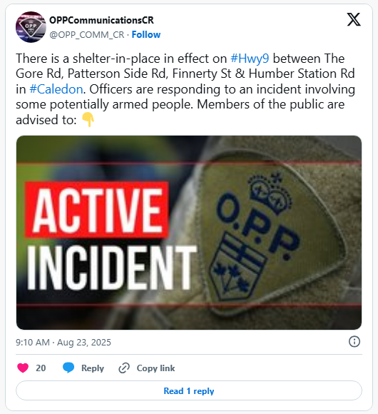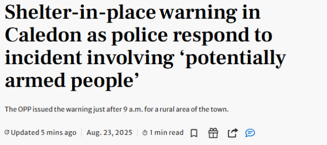 - https://www.thestar.com/news/gta/shelter-in-place-warning-in-caledon-as-police-respond-to-incident-involving-potentially-armed-people/article_81cef0c6-1a3d-4aae-b44b-d3fca52490e0.html