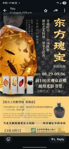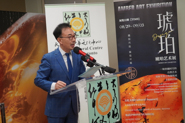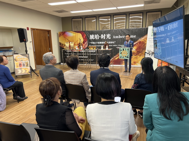由辽宁省抚顺市恒玖珠宝、辽宁省抚顺市文旅局联合主办的“穿越时空·中国抚顺非遗琥珀艺术特展”于2025年8月29日在大多伦多中华文化中心隆重开幕。