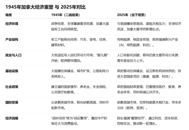 1945年二战结束后,加拿大经历了一次彻底的经济“重塑”,这是财政部长尚鹏飞所提到的历史背景。当时加拿大从一个以农业和原材料出口为主的经济体,转型为以制造业、建筑业和服务业为支柱的现代工业国家。这一时期奠定了加拿大战后几十年繁荣与中产阶级壮大的基础。
