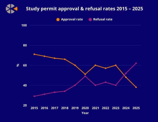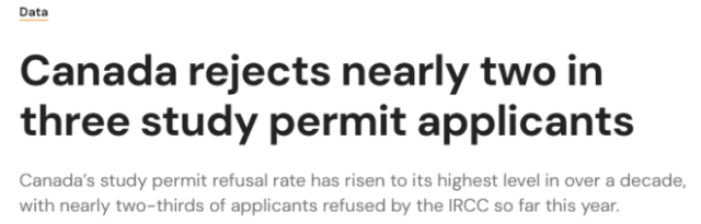 IRCC的记录显示,拒签率目前已达到十年来的最高水平。报告显示,印度申请者首当其冲,高达80%的申请被拒。虽然各国的具体数据尚未公布,但教育媒体Pie News报道称,拒签率的大幅上升预示着其将对亚洲、非洲及其他地区产生连锁反应。
