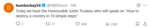 “今天,我们邀请到了尊敬的贾斯汀·杜鲁多,他将就‘如何以10个简单步骤摧毁一个国家’发表演讲。”