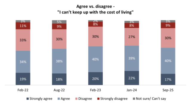 最新数据显示,加拿大经济在进入秋季前既有积极信号也有负面压力。积极的一面是,租房者和房贷人群对住房成本的担忧较去年9月略有缓解。另一方面,近五分之三(57%)的加拿大人仍表示无法跟上生活成本的上涨,这一趋势自2022年以来一直持续。