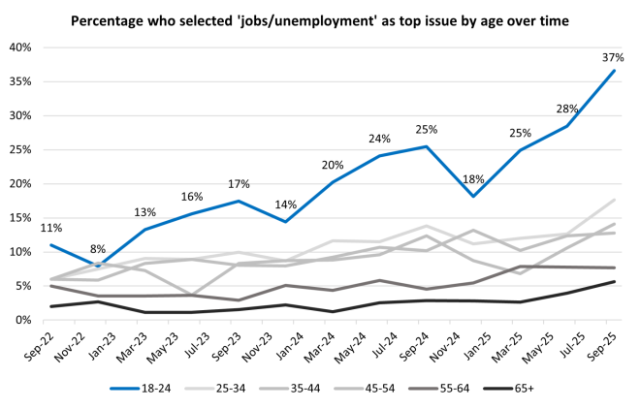 接近五分之二(37%)的18至24岁受访者将就业和失业列为当前国家面临的首要问题。这一比例是去年12月(18%)的两倍,比今年6月(28%)又上升了 9 个百分点。