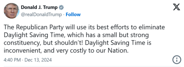 2024年12月,美国总统特朗普在X平台发文表示,他的政党将尽力废除夏令时,称其“麻烦”且“代价高昂”。