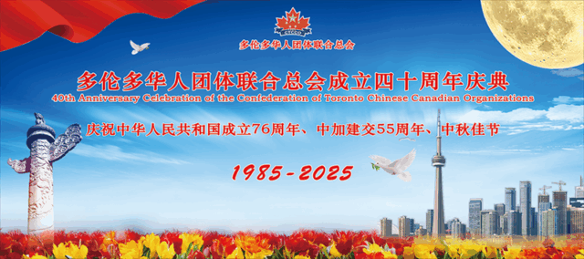 2025年10月5日晚,中秋佳节前夜,秋意渐浓的多伦多洋溢着节日的喜庆与团圆氛围。金瑞麟大酒楼的宴会大厅华灯璀璨、人声鼎沸,由多伦多华人团体联合总会主办的“多伦多华人团体联合总会成立40周年庆典暨庆祝中华人民共和国成立76周年、中加建交55周年 & 中秋佳节晚会”在此隆重举行。