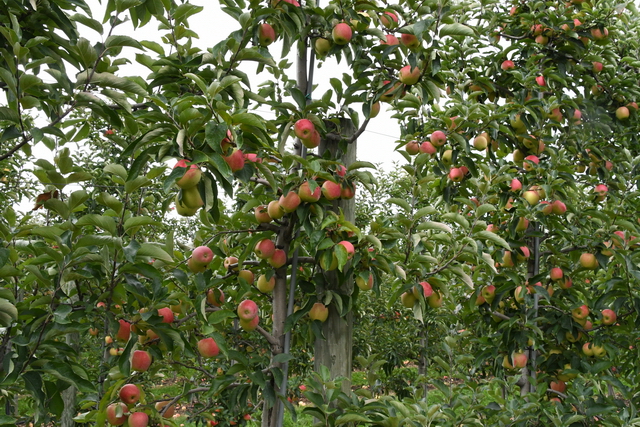 农场的大门旁竖着手绘的“Pick Your Own Apples”标牌,谷仓木墙斑驳,空气里弥漫着泥土与果香。游客们乘坐木板车,沿着果树排列的林间小道缓缓前行。树枝上压满红润的果实,仿佛整个秋天都藏在这片果园里。
