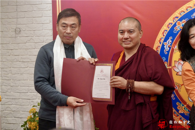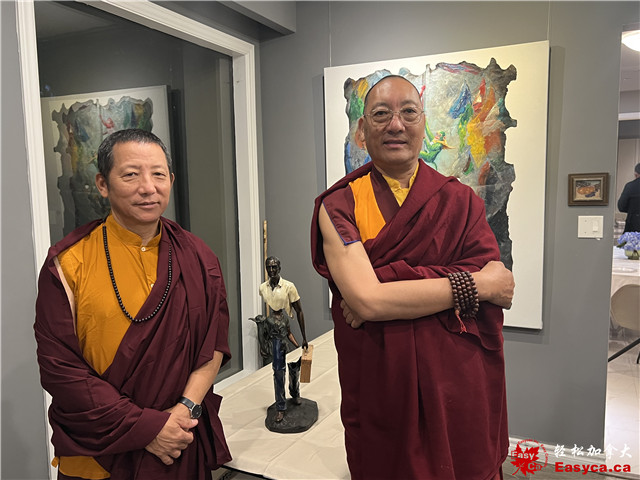 着名画家、加拿大中华艺术协会会长左晋敬献其创作的佛教主题油画《法界光明》郑重赠予堪布,堪布对此艺术供养表示随喜赞叹,并回赠礼敬