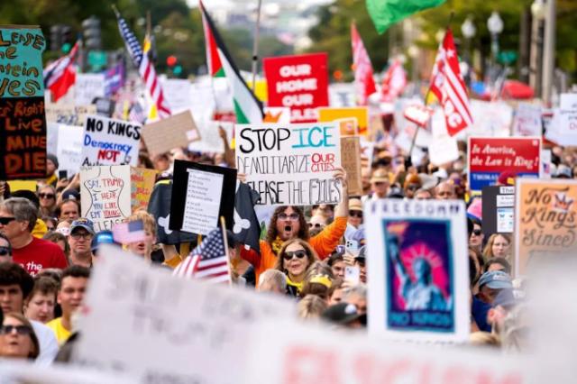 综合美联社、路透、CNN等报导,18日全美50州各大大小小城镇上演超过2600场“不要国王”示威行动,数百万人走上街头抗议川普多项政策,包括美国移民与海关执法局(ICE)强硬打击非法移民、向芝加哥等城市强制部署国民兵、削减健康照护等联邦计划。