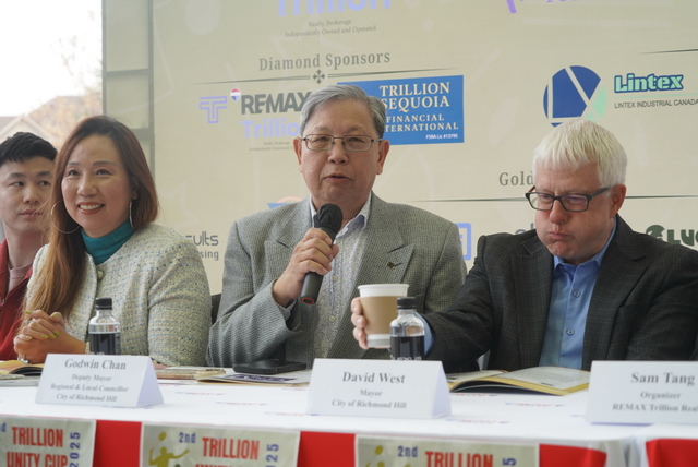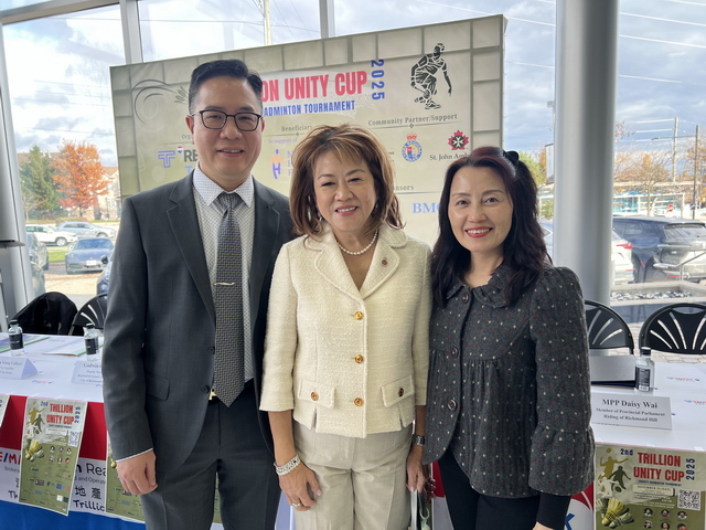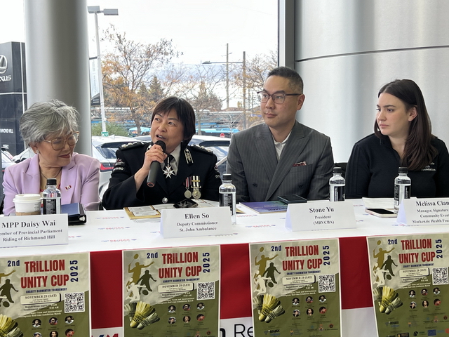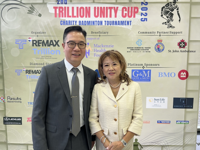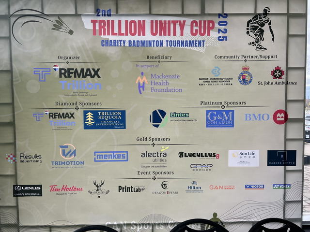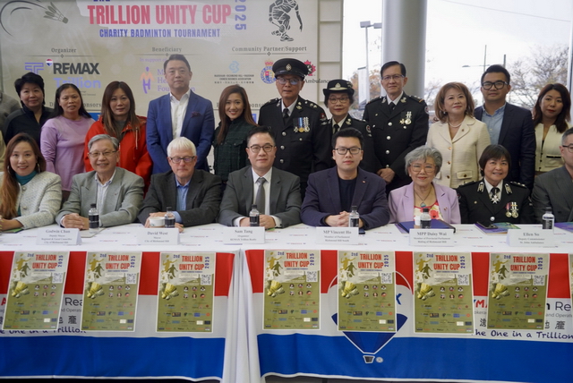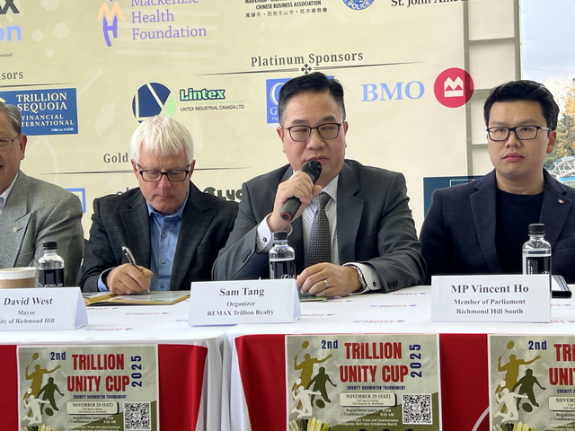 由RE/MAX Trillion Realty滶㻽国际地产主办,万锦市、烈治文山市、旺市华商会(MRVCBA)协办,受惠机构Mackenzie Health Foundation的笫二届滶㻽杯慈善羽毛球比赛「Trillion Unity Cup」于11月13日在Lexus of Richmond Hill举行新闻发布会,宣布比赛将于11月29日上午9点至下午5点在万锦市的 Can Sports Center正式举行。