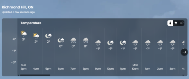 天气预报显示,多伦多以北的万锦、列治文山将从周日下午3点多开始飘雪,一直持续到周一早上9点,连下18小时,预计将出现5至10厘米的积雪。