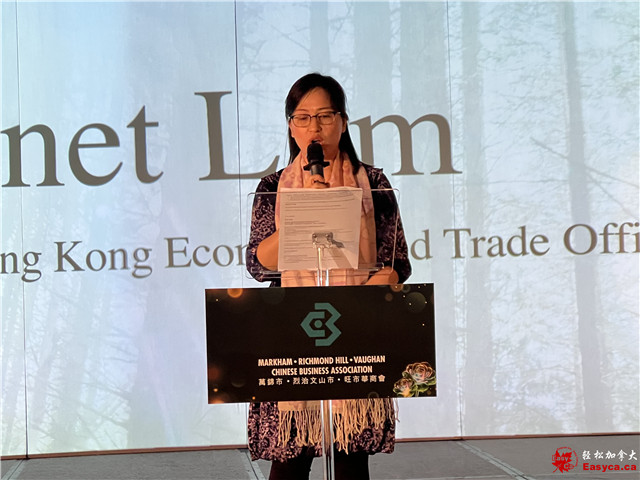 香港经济贸易办事处(多伦多)署理副处长林家欣致词并与会长合影