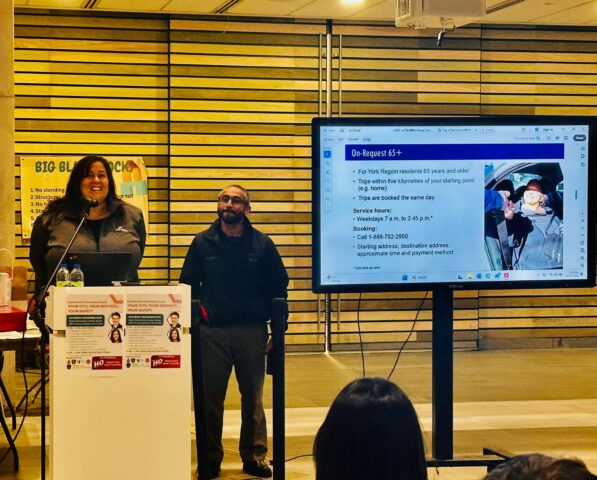 约克区公车局(YRT):代表 Tara McGrath 与 Umaharan Sivarajah 向居民介绍区内公共交通服务规划、无障碍出行设施,65岁以上按需出行服务等等