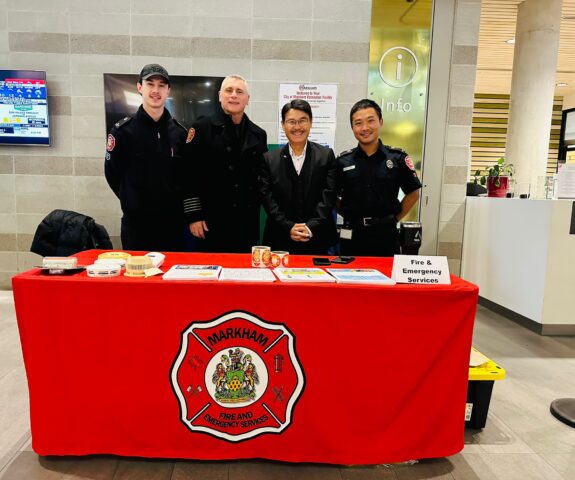 万锦消防局(Fire& Emergency Services):局长 Chris Nearing 亲自到场带领团队 Wei Huang、Carter Forget,向市民讲解防火知识、住宅火警预防提示等内容。
