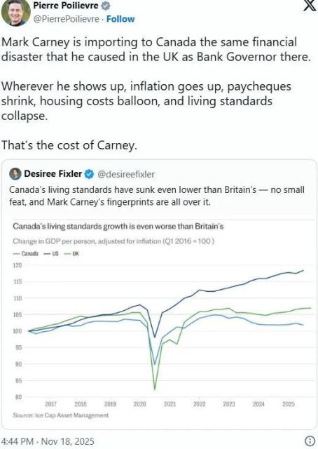 偏偏在万斯发言前几天,加拿大保守党领袖博励治也发了同一张图表,指着卡尼政府说加拿大经济就是这样被拖垮的。反对党与美国副总统突然形成了奇妙“合唱”,矛头一致指向经济下滑、物价飞涨以及过快的人口增长。
