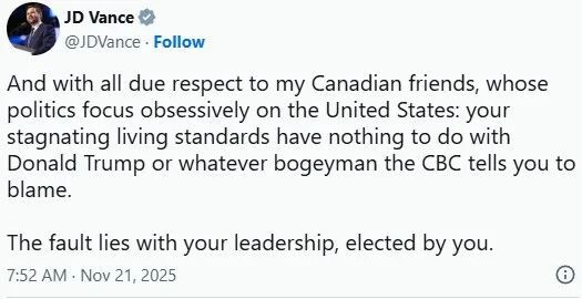 开炮的人不是别人,是美国副总统 JD·万斯。他突然在 X(前推特)上发了一连串贴文,直接点名加拿大,说我们“陷入移民疯狂”,搞得生活水平越来越糟。这话一丢出来,瞬间在社交平台炸开锅。