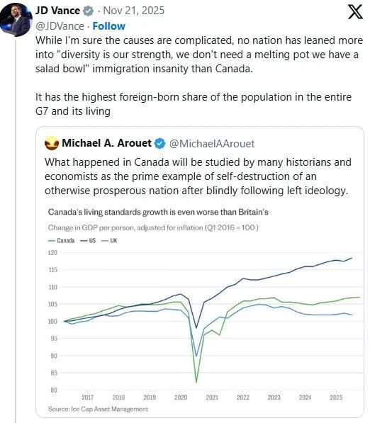 万斯看到后毫不客气,直接留言说:全球范围内,没哪个国家像加拿大这样,拼命往自己国家塞移民,还自豪地说“多元就是力量”“我们是沙拉碗不是大熔炉”。但现实却是——移民比例是G7最高,可生活水平偏偏不涨,还掉队。