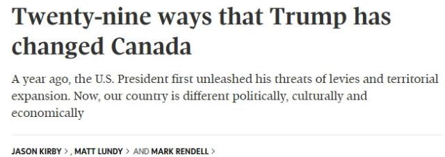 加拿大总理卡尼称美国总统特朗普为“变革者”(transformative)。就在特朗普首次挥舞关税与所谓吞并威胁整整一年后,加拿大确实已经面目全非。