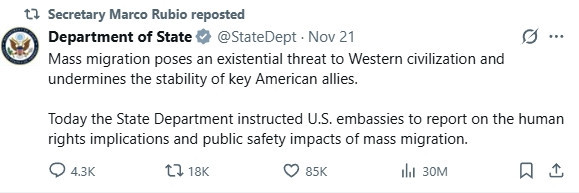 据《纽约时报》报道,美国国务院已指示其驻加拿大及其他西方国家的使领馆,审查“大规模移民”的影响。上周发给各地使馆的电文要求驻渥太华、新西兰、澳大利亚和西欧国家的外交官,报告大规模移民对人权和公共安全的影响,并称其为“对西方文明的生存性威胁”。
