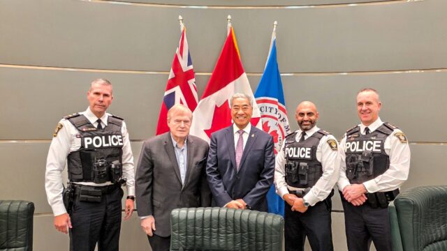 左:约克警区副警察总长Paulo Da Silva、万锦市区域议员Jim Jones、联邦议员国会马荣铮、警司 Chirag Bhatt及督察Brad Weick