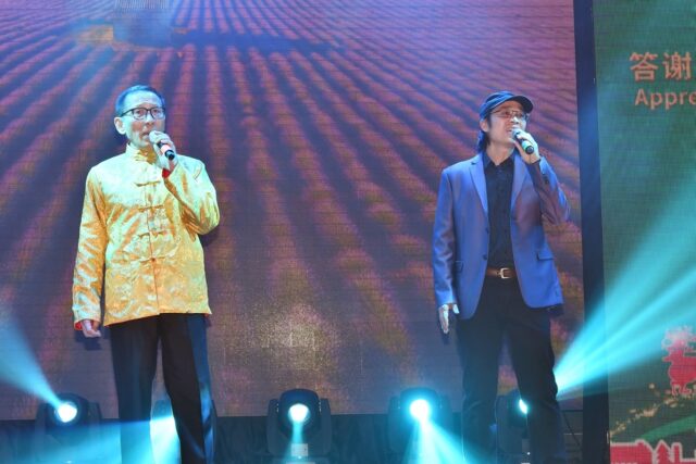 图为:万锦市长薛家平与总会秘书长刘莹携手献唱