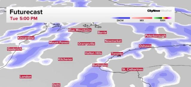 这次降水最初以湿雪为主,但中午前后在湖岸附近可能夹杂降雨;而越往多伦多以北和以东地区,降水越有可能保持为纯降雪。