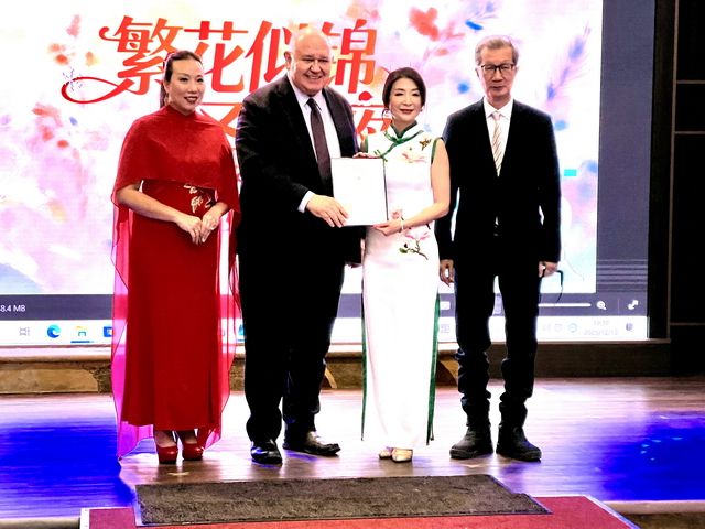 活动中,万锦市市长薛家平不仅为舞团颁发证书并合影留念,还登台献唱《月亮代表我的心》,熟悉的旋律勾起全场共鸣,掌声雷动。晚宴特设颁奖环节,对为舞团发展作出突出贡献的个人予以表彰:苏满获年度卓越贡献奖,Fion获年度飞跃成长奖,甘甜、李泊山、林青获年度卓越导师奖,高嘉慧获年度杰出协作奖,Tracy Wang获年度魅力典范奖,刘小栗获终身荣誉成就奖,Zoe Li获年度新星潜力奖。