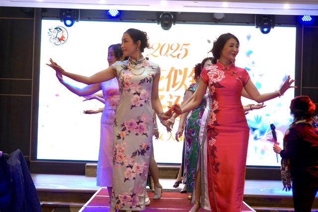 随后,舞团精心编排的舞蹈《给我一个吻》、特级教师甘甜的独舞《盈盈芙蓉语》、资深舞团成员兼健身教练高嘉慧与队员们合作的健身操、古典舞《青花瓷》等节目轮番登场,或婉约雅致,或活力满满,充分展现了舞团成员的多元艺术风采。旗袍秀《甜蜜蜜》与轻舞蹈《高山青》更是将中式美学与舞蹈艺术巧妙融合,尽显优雅韵味。