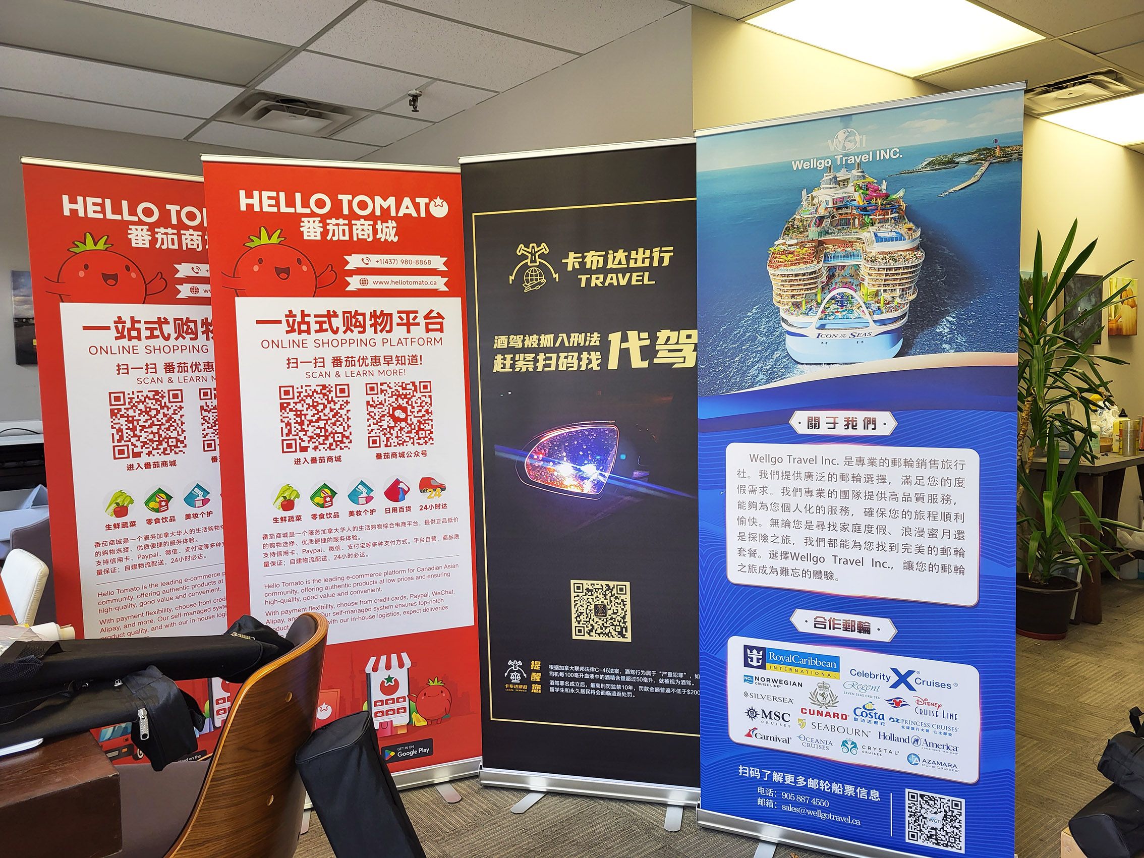 易拉宝:85cm X200cm. 易拉宝价格为新促销价$93, 均为不卷边的画布料,物超所值,西人同类材质均超过$150。提供设计服务。