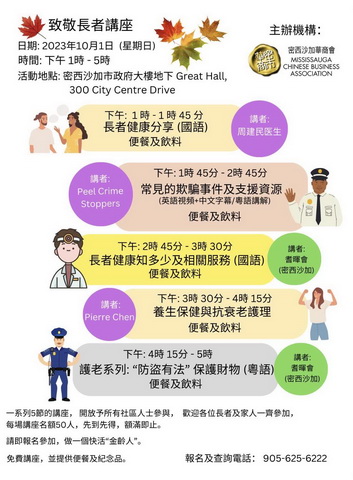 今年另一個主題是「致敬長者 Salute to Seniors」,很多長者缺乏生活的重要資訊,今次活動目的是希望可以令更多長者和他們的家人,獲得更多有用的資訊,使他們可以活得精彩,同時有助鼓勵他們積極參與社區活動。 「致敬長者 Salute to Seniors」除了會於當日有多個攤位向長者提供多類型的健康生活資訊外,由12時至4時,會分別舉行五場由密西沙加耆暉會 、Peel Crime Stoppers、 醫生、專業人士講解的講座。五場講座的題目都與長者健康生活及安全問題有關,例如是長者健康生活資訊、⼼理健康的知識、防盜有法”- 保護財物和活出健康生活需知,以及長者如何保持身心健康等。